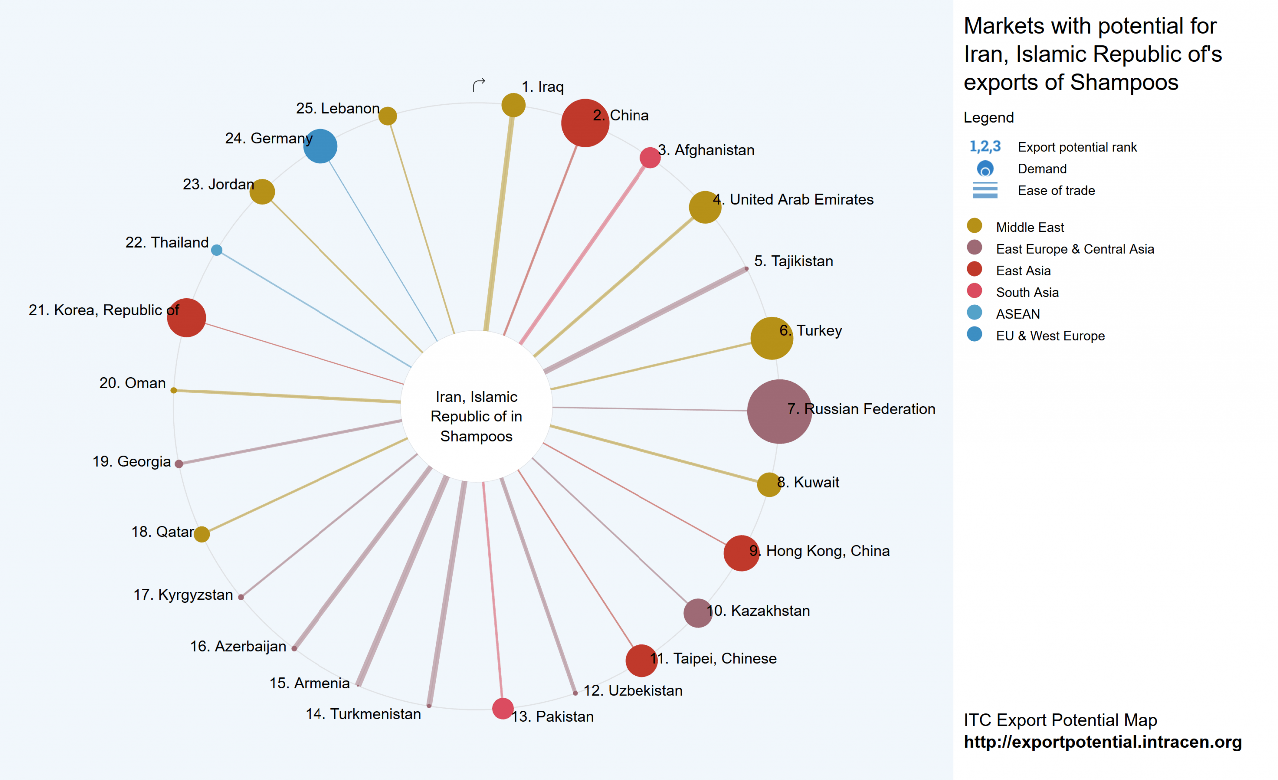 در این نمودار میزان توان و ظرفیت صادرات به کشورهای دیگر را به ترتیب عددی، که نشان دهنده ی رتبه پتانسیل صادراتی و به ترتیب اندازه دایره، که نشان دهنده ی میزان تقاضای کشورها و به ترتیب پهنای خط، که نشان دهنده ی سهولت معامله با آنهاست، میتوان مشاهده کرد.