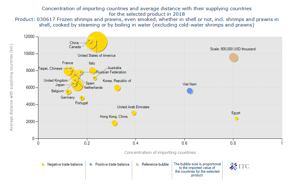 هرچه دایره ها به سمت بالاتر باشند گویای این است که فاصله ی کشور واردکننده تا محل تامین آن بیشتر است به عبارتی شعاع فاصله ای که میتوانیم در آن فعالیت کنیم بیشتر است و اگر خط عمودی این نمودار زیر ۲ الی ۳ هزار کیلومتر را نشان بدهد یعنی حمل و نقل و تامین کالای مورد نظر بسیار مهم و موثر می باشد پس راهکارهای حمل و نقلی را باید بررسی کرد.
