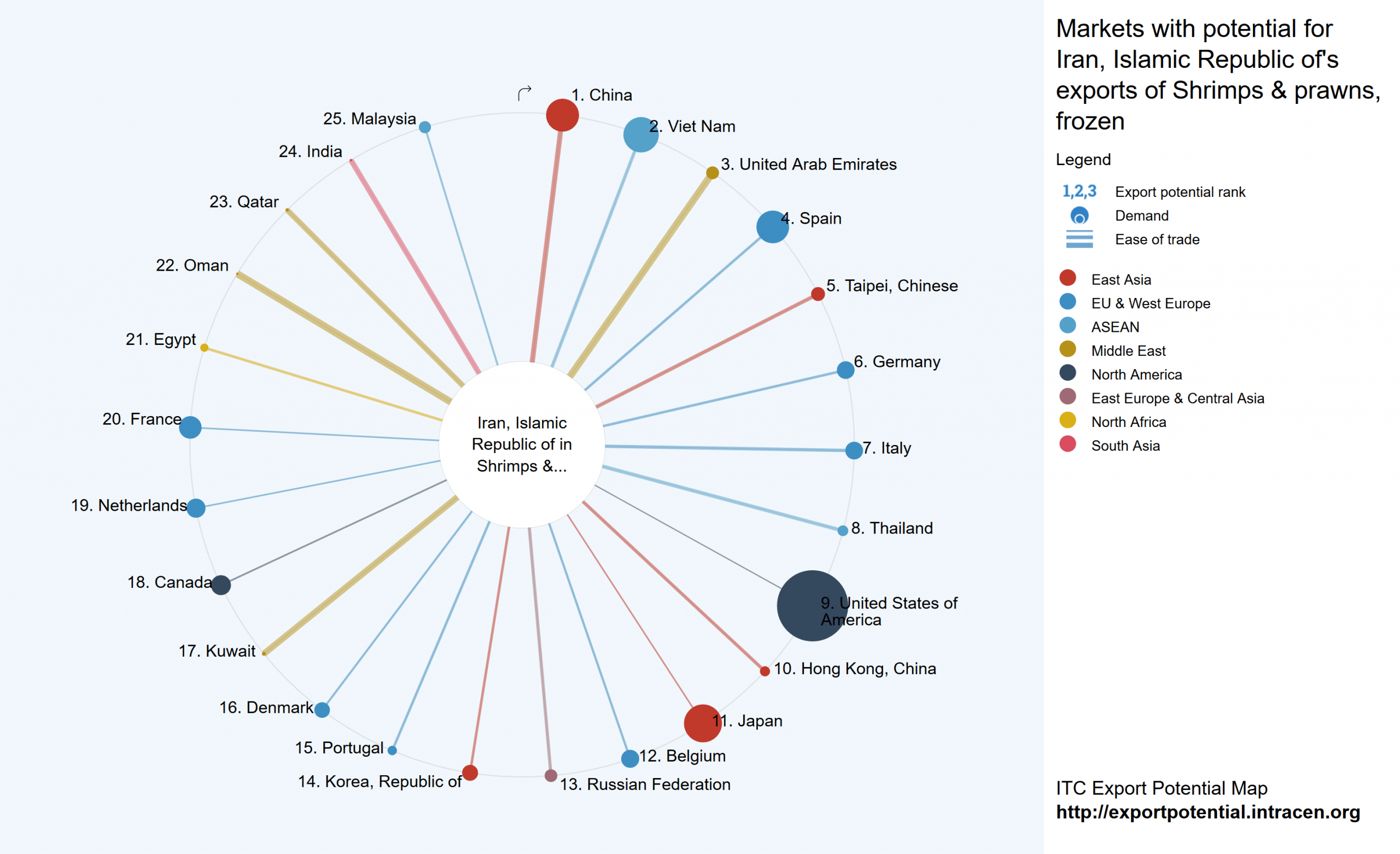 در این نمودار میزان توان و ظرفیت صادرات به کشورهای دیگر را به ترتیب عددی، که نشان دهنده ی رتبه پتانسیل صادراتی و به ترتیب اندازه دایره، که نشان دهنده ی میزان تقاضای کشورها و به ترتیب پهنای خط، که نشان دهنده ی سهولت معامله با آنهاست، میتوان مشاهده کرد.