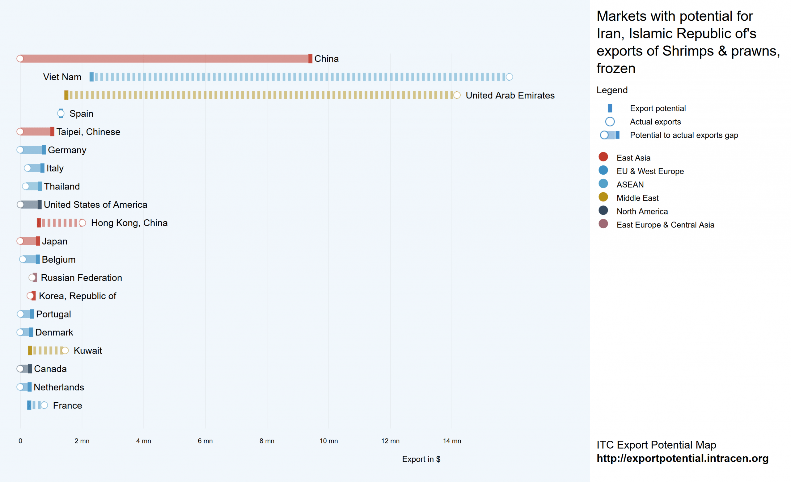چین بیشترین تفاوت بین پتانسیل صادرات و صادرات واقعی را از نظر ارزش نشان می دهد ظرفیت باقیمانده صادرات به ارزش ۹٫۳ میلیون دلار است.