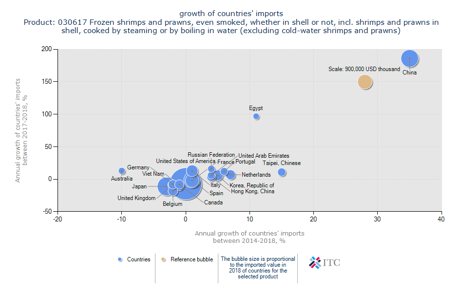 چنانچه زیر صفر و منفی باشد یعنی فرصت های تجاری این بازار در حال از بین رفتن است و آینده قابل پیش بینی ندارد و تمرکز اصلی را باید روی بازار کشورهای بالای نمودار گذاشت و حجم و اندازه دایره های این نمودار نیز نشان دهنده ی رقم میزان تجارت کشورهاست.