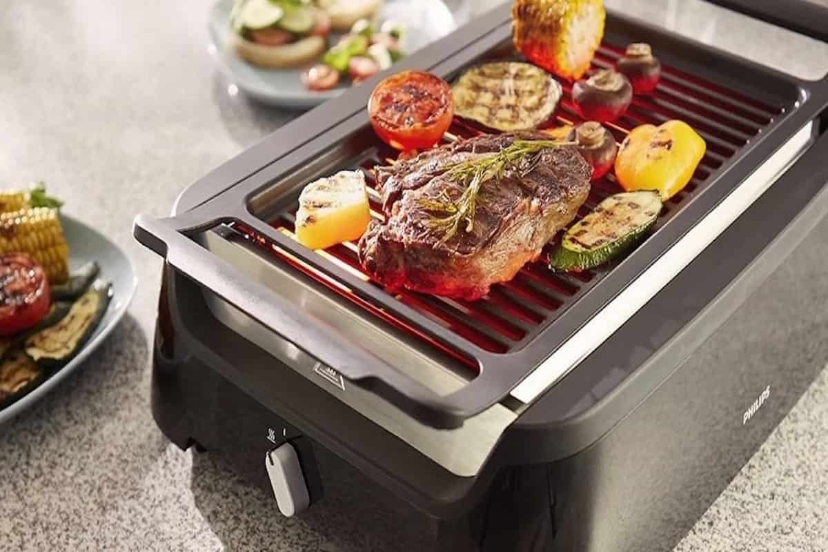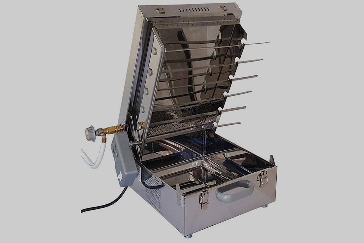 کباب پز برقی بدون دود همراه با سیخ گردان به دلیل مزایا و ویژگیهای ایمنی زیادی که دارد توانسته نیاز اکثر مصرف کنندگان خود به این وسیله را برطرف سازد و نسبت به انواع دیگری از این وسیله دارای محبوبیت بیش تری است. کباب پز بدون دود برقی در یک ابعاد استاندارد کوچک، زیبا و مناسب برای محیطهای متفاوت طراحی و ساخته شده است و تمامی افراد می توانند از این وسیله بر روی کانتر آشپزخانه خود استفاده کنند و می توانید برای پخت انواع گوشت، میگو، ماهی و سبزیجات از آن استفاده کنید می توانید غذای خود را درون این وسیله برای گرم کردن قرار دهید و بهتر است کم ترین درجه حرارت را برای این کار در نظر بگیرید. اگر قرار است گوشت قرمز یا سفید را درون آن طبخ کنید بهتر است از یک شبانه روز قبل با مواد مورد نظر و طبق سلیقه شخصی خود آنها را مزه دار کنید و سپس با توجه به نوع گوشت درجه حرارت مناسب را انتخاب کرده و گوشت را درون کباب پز برقی قرار دهید. در کناره های این دستگاه دو دستگیره برای نگه داشتن موقع حمل و نقل و جلوگیری کردن از سوختن دست شما تعبیه شده است صفحات و سیخهای داخل محفظه کباب پز از جنس چدن بوده که به سرعت داغ می شود و این ویژگی را دارد که محتویات داخل آن به دیواره آن نچسبد.