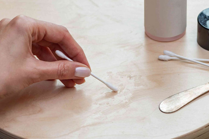 اگر حلال در دسترس نبود برای پاک کردن این ماده از روی چوب می توانید از استون استفاده کنید استون را بدون اینکه با آبی ترکیب کنید به پنبه آغشته نمایید و بر روی قسمتهایی مورد نظر بمالید دقت کنید به قسمتهای دیگر مالیده نشود و به آرامی بکشید تا پاک شود.