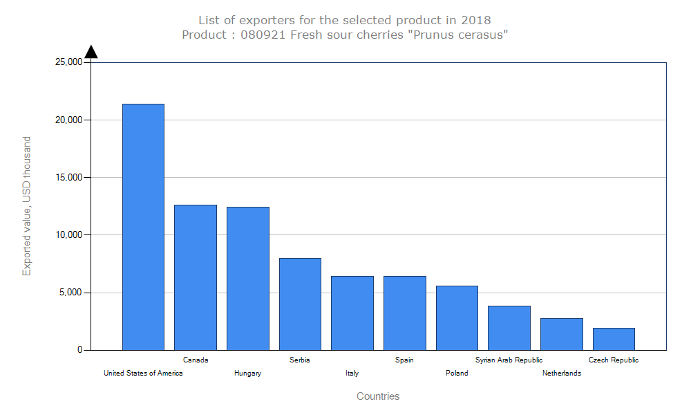 عمده صادرات آلبالو از کشور آمریکا انجام می شود و کشورهای کانادا، مجارستان، صربستان و ایتالیا در رتبه های بعدی قرار دارند.