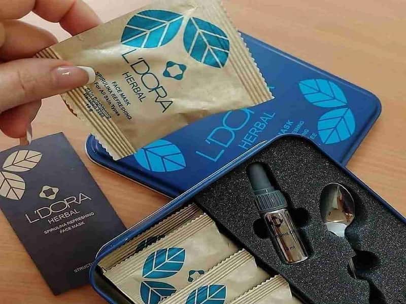 ماسک جلبک اسپیرولینا لدورا صرفا در داخل یک پک فلزی ارائه می شود به گونه ای که پک فلزی مورد نظر دارای ابعاد مربعی بوده و صرفا در داخل آن، 10 و 15 عدد بسته هربال که حاوی متریال ماسک مورد نظر است، وجود دارد.