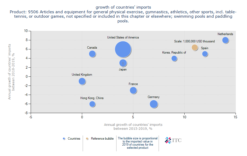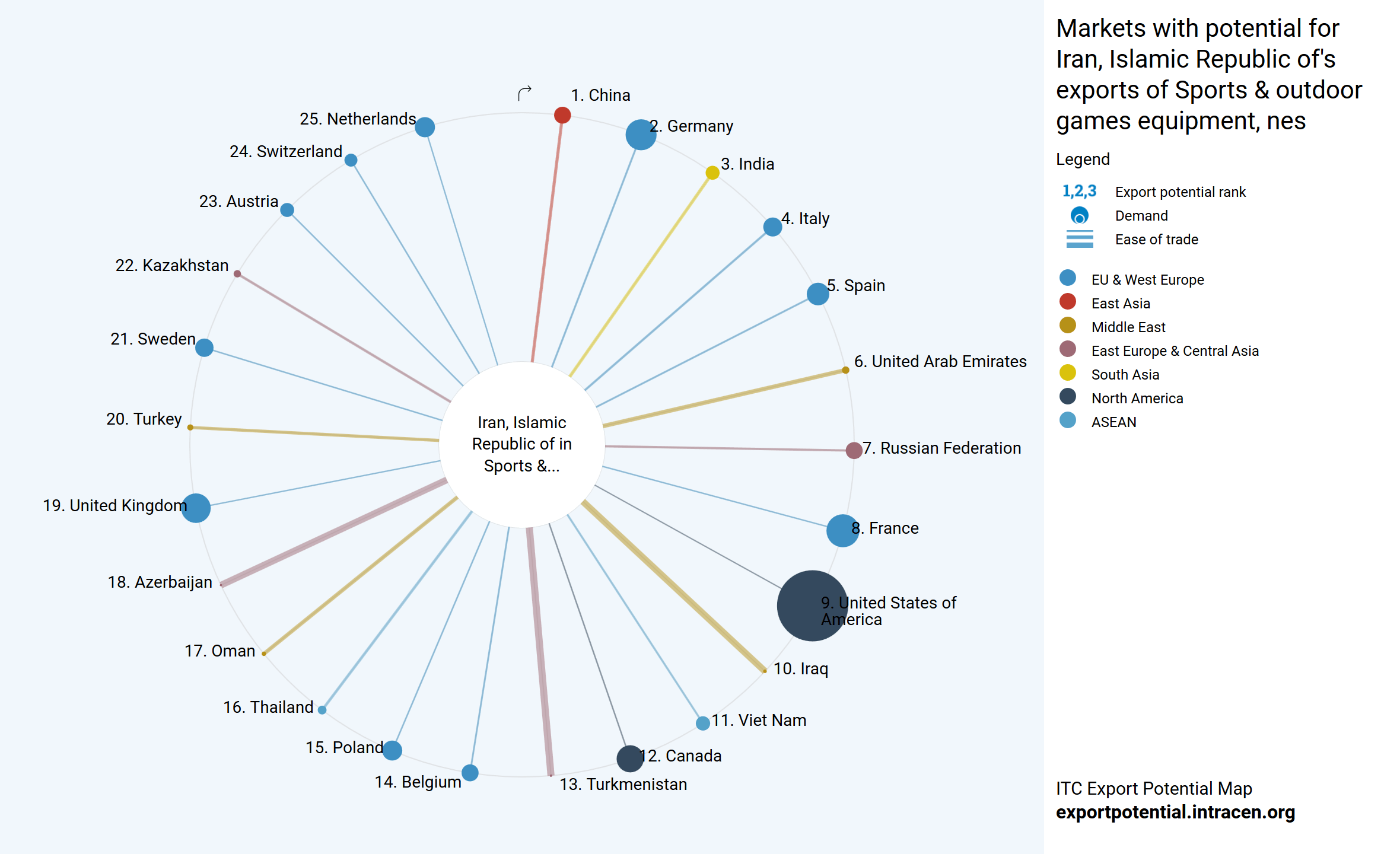 با توجه به این نمودار کشورهای چین، هند، امارات، عراق، ویتنام، تایلند، عمان و ترکیه در آسیا بیشترین ظرفیت واردات از ایران را دارند. هم چنین کشورهای روسیه، ترکمنستان، آذربایجان و قزاقستان در حوزه CIS و آلمان، ایتالیا، اسپانیا، فرانسه، آمریکا، کانادا، بلژیک، لهستان، انگلیس و سوئد تقاضای زیادی برای واردات لوازم ورزشی دارند.