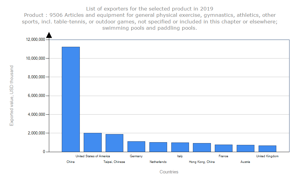 براساس این نمودار کشور های چین، آمریکا، چین تایپه، آلمان و هلند پنج کشور برتر صادر کننده ی لوازم ورزشی هستند. بازار جهانی صادرات لوازم ورزشی به صورت انحصاری در دست چین با داشتن ۱۱,۲۳۸,۸۵۴ هزار دلار و ۴۰ درصد از سهم بازار جهانی بالاترین میزان صادرات لوازم ورزشی دارد.