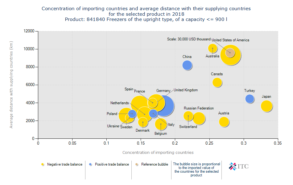 هرچه دایره ها به سمت بالاتر باشند گویای این است که فاصله ی کشور واردکننده تا محل تامین آن بیشتر است به عبارتی شعاع فاصله ای که میتوانیم در آن فعالیت کنیم بیشتر است.