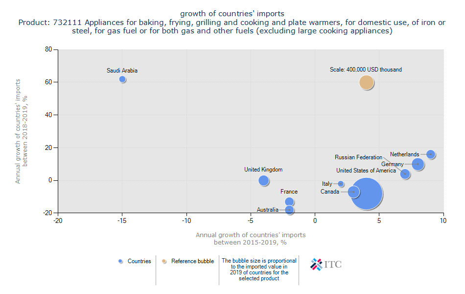 همانطور که نمودار بالا نشان می دهد اجاق گاز از آمار رو به رشدی برخوردار است و هلند، آلمان و روسیه در یک و پنج سال گذشته و آمریکا، کانادا و ایتالیا در پنج سال دارای بازار با ظرفیت رو به رشد هستند.