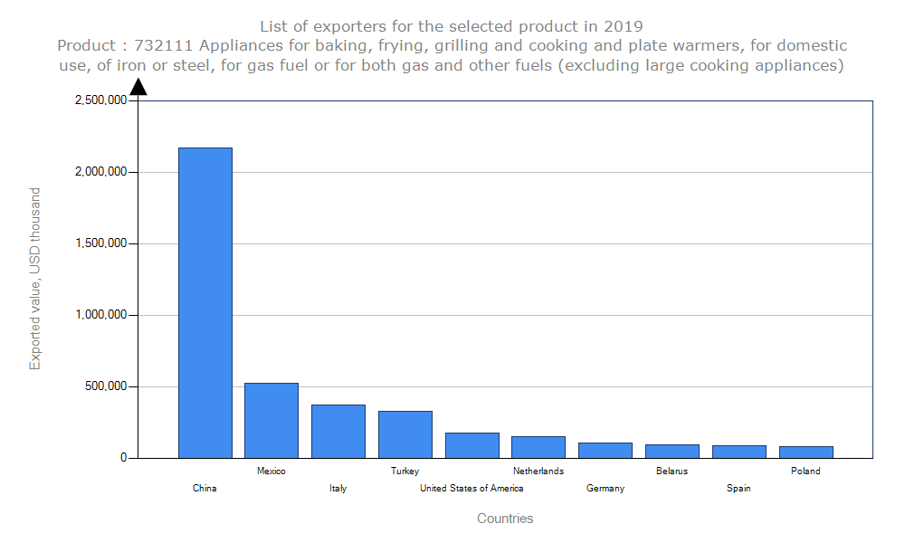 عمده صادرات اجاق گاز از کشور چین با ۴۶ درصد از سهم بازار جهانی و ۲,۱۷۰,۷۳۸ هزار دلار انجام می شود و کشورهای مکزیک، ایتالیا، ترکیه و آمریکا در رتبه های بعدی قرار دارند. آمریکا بیشترین واردات این محصول را ۲,۰۷۷,۸۸۱ هزار دلار و ۳۹ درصد دارد. آلمان، کانادا، انگلیس و روسیه به ترتیب بعد از آمریکا بیشترین واردات اجاق گاز را دارند.
