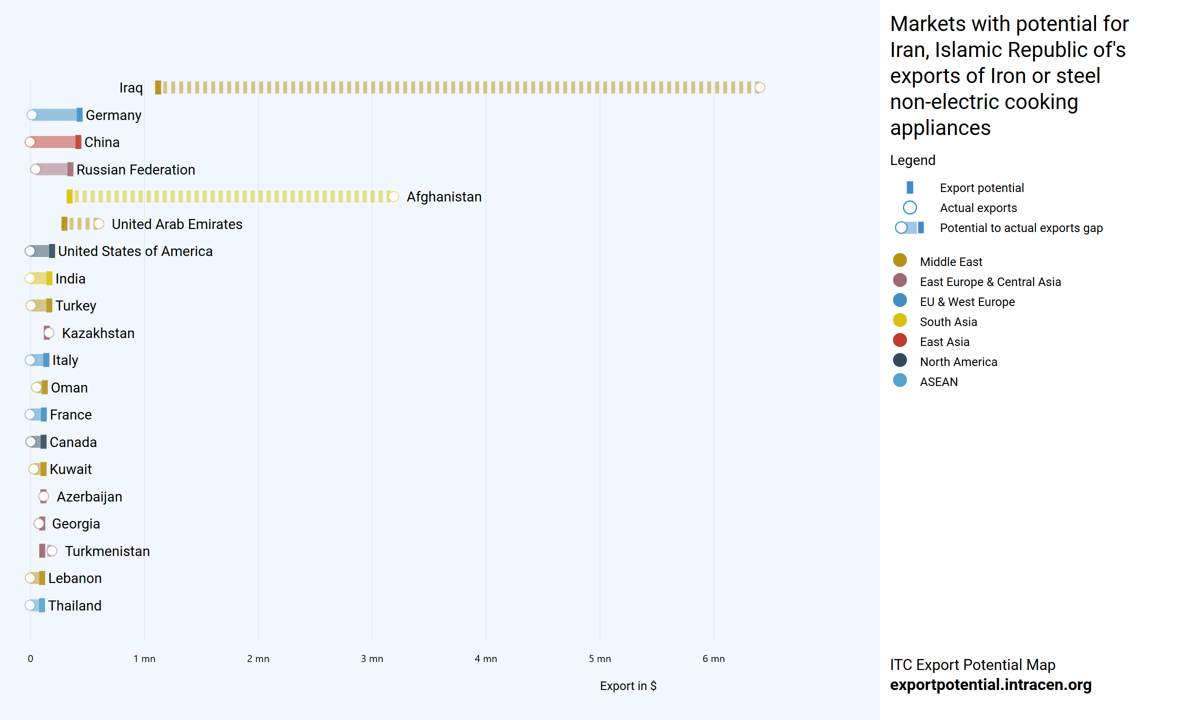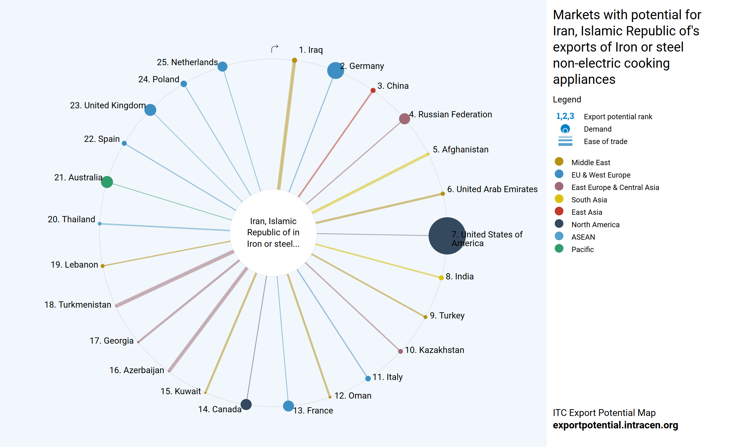با توجه به نمودار زیر کشورهای عراق، چین، افغانستان، امارات، هند، ترکیه، عمان و کویت در آسیا و هم چنین آلمان، ایتالیا، فرانسه، اسپانیا و انگلیس در اروپا دارای پتانسیل بالا برای صادرات اجاق گاز از ایران هستند.