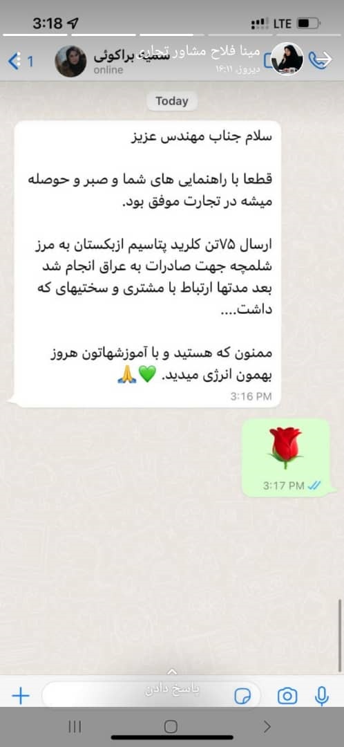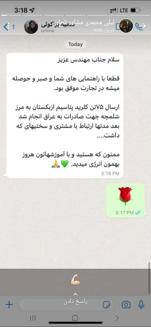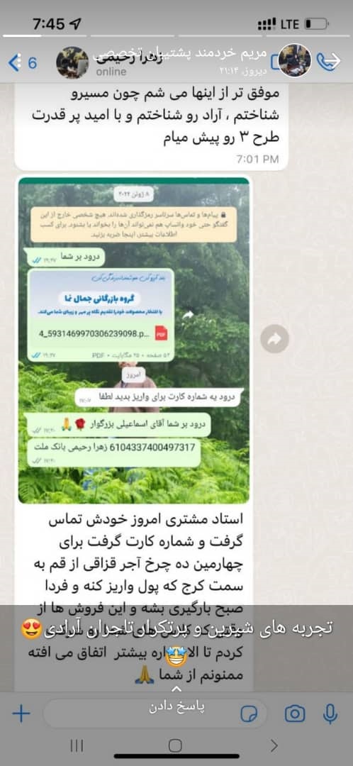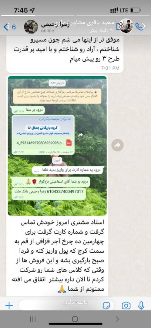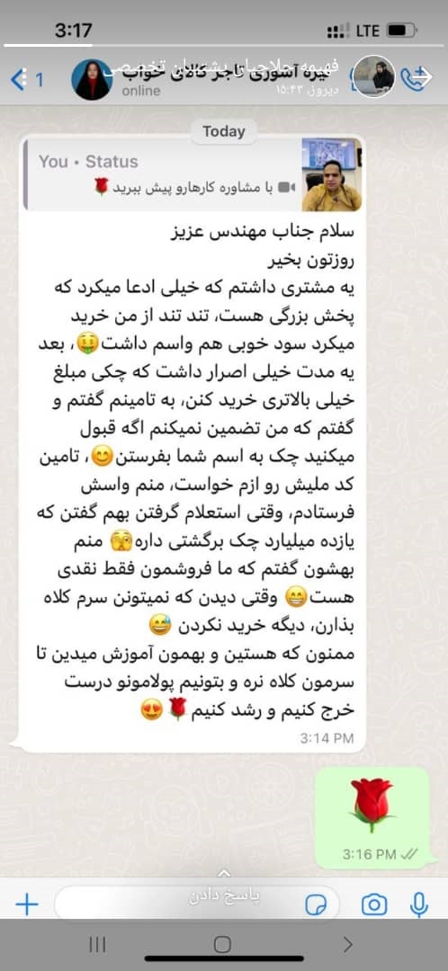 لیلی محمدی یکی دیگر از مشاوران تجاری، تصویر پیامک ارسالی یکی از آرادیهای موفق را در وضعیتی به اشتراک گذاشتند.