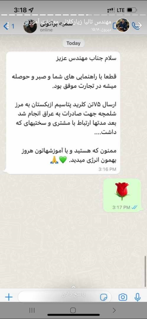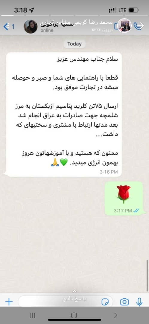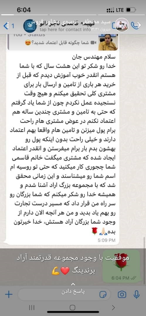 فهیمه حلاجیان از نیروهای فعال بخش پشیبانی تخصصی، تصویری از پیام رضایت مشتری تاجر موفق آرادی را در استاتوس خود به نمایش گذاشت.