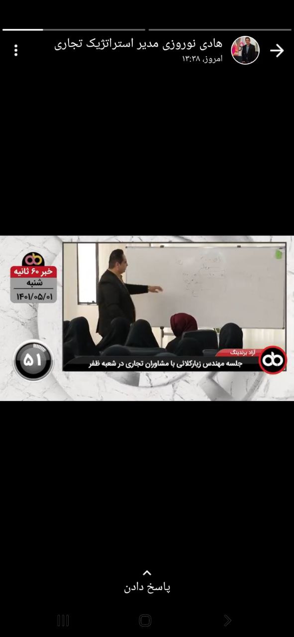 هادی نوروزی مدیر استراتژیک مجموعه، محمد قاسمی از مشاوران تجاری، فرزانه عرفانی دوست از واحد مالی، فاطمه میرزائی از نیروهای پویا کارگزینی، اعظم خدری از نیروهای بخش اداری، اخبار 60 ثانیه روز شنبه را در وضعیت خود منتشر کردند.