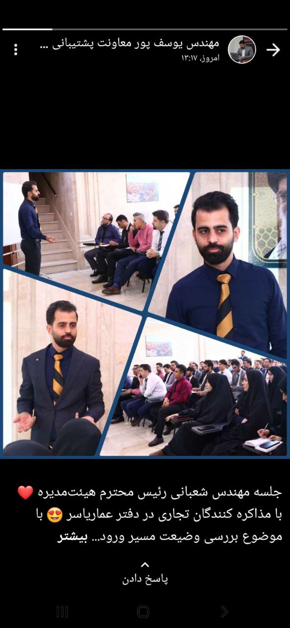 مهندس قربانی مدیر عامل محترم مجموعه، مهندس موشانی مسئول دفتر مدیرعامل، لیلی محمدی و مینا فلاح از مشاوران تجاری، فاطمه حسنی سرپرست شعبه لنکران تهران، حامد حدادی و سیده راضیه باقرزاده از نیروهای فعال واحد نظارت، فاطمه گل فشان از نیروهای محتوا، زهرا محمدزاده از نیروهای ناظر محتوا، زهرا رضایی از نیروهای فعال بخش فنی و سایت، ابراهیم علی نژاد از بخش اداری، علی ترابی مدیر داخلی طرح 3، تصویری از جلسه هم افزایی مهندس قربانی با پرسنل بخش عنوان را در وضعیت خود منتشر کردند.