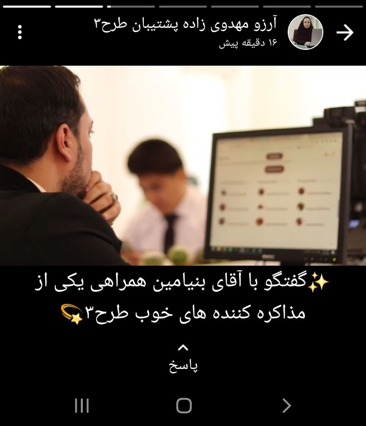 آرزو مهدوی زاده از پشتیبانان تخصصی، یکی از جدید ترین تولیدات واحد رسانه با موضوع مصاحبه با بنیامین همراهی از مذاکره کنندگان طرح 3 را در وضعیت خود به نمایش گذاشت.