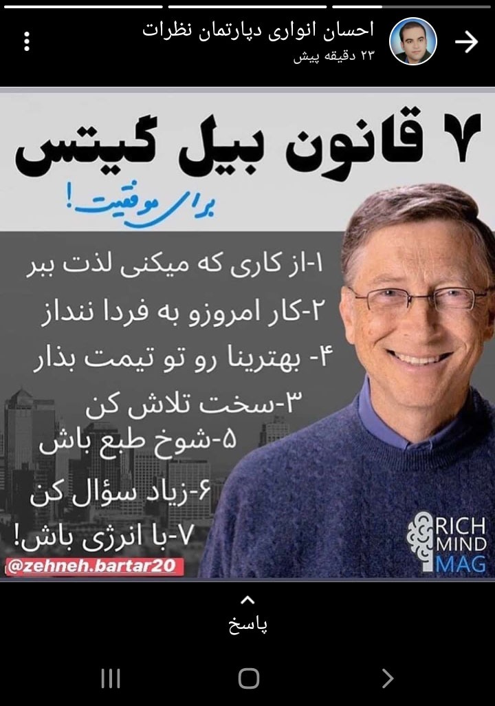 احسان انواری از همکاران دپارتمان نظرات، مهم ترین قوانین موفقیت بیل گیتس را در وضعیت خود به نمایش گذاشت.