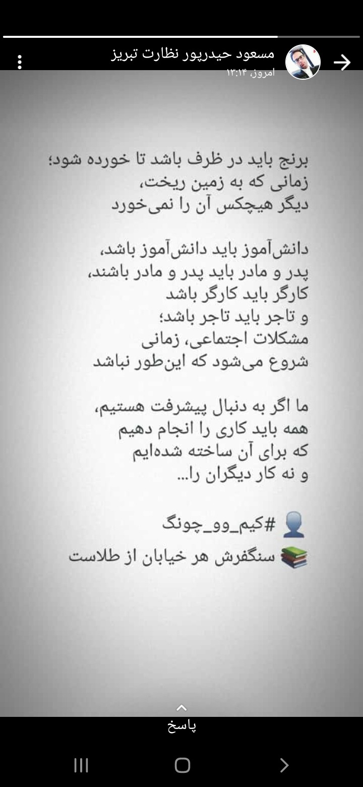 مسعود حیدر پور از همکاران واحد نظارت مستقر در شهر تبریز، با انتشار مطلبی پر محتوا از کیم_ وو_ چونگ مبتکر شرکت دوو کره، لزوم ورود علاقه مندان تجارت به این حوزه را متذکر شد.
