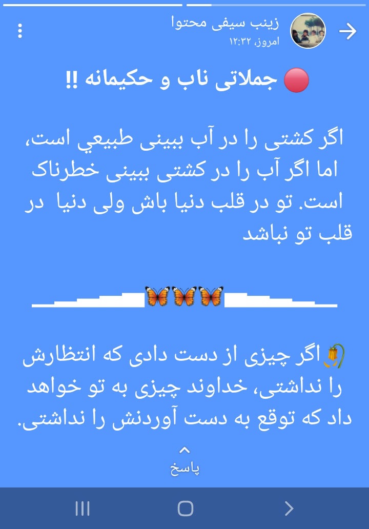زینب سیفی از دیگر همکاران محتوا، با انتشار متنی آرامش بخش به همراهان خود نوید نزول نعمت های بزرگ تر از شکست به آنها داد.