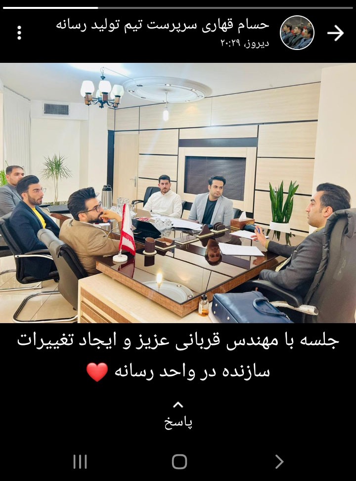 حسام قهاری سرپرست تیم تولید رسانه، با تصویری از جلسه مدیر عامل ارجمند با معاونت فنی و سایت و معاونت رسانه همچنین سرپرست های واحد های مرتبط، از ایجاد تغییرات سازنده در این دو واحد خبر داد.