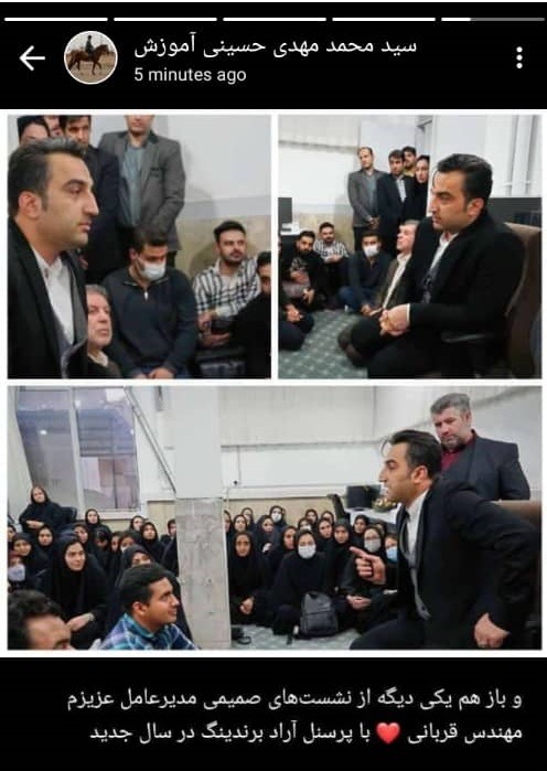 سید محمد مهدی حسینی از همکاران واحد آموزش، وضعیتی از نشست صمیمانه مدیر عامل مجموعه، با پرسنل را منتشر کرد.