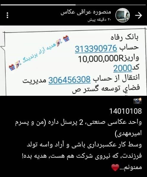 منصور عراقی از همکاران عکاس صنعتی، با انتشار وضعیتی از پرداخت هدیه تولد فرزند خود توسط واحد مالی مجموعه، قدر دانی نمود.