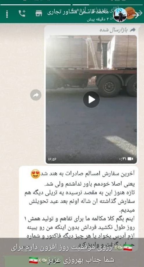 محمد قاسمی یکی دیگر از مشاوران تجاری، با انتشار تصویر ارسال بار یکی از تجار مجموعه، موفقیت روز افزون را برای ایشان آرزو نمود.