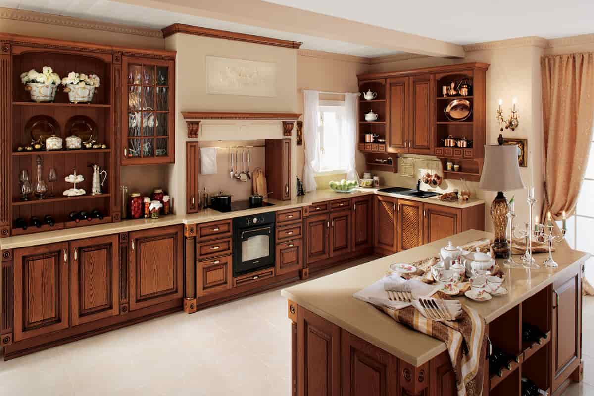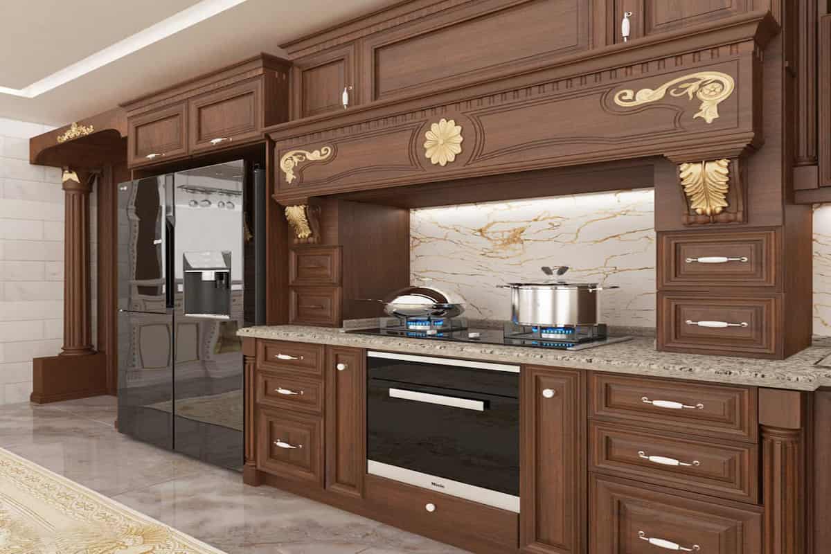4. اگر فضای آشپزخانه تان بزرگ است استفاده از طرح های ریز و شلوغ برای کابینت کلاسیک مو جب زیباتر شدن دکوراسیون می شود البته به این نکته توجه داشته باشید که تمیز کاری کابینت کلاسیک روکش چوب با طرح های شلوغ به دلیل ریزه کاری های زیادی که دارد کمی دشوار است.