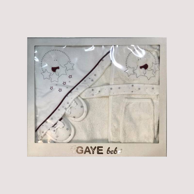 ست حوله گایه پنج تکه است که شامل حوله بدن کلاهدار، دستکش، دمپایی حوله ای، لیف و یک حوله تن پوش می باشد.
