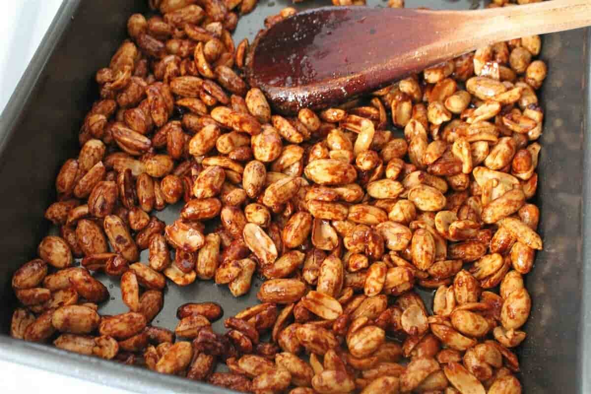 در مرحله بعدی این بادام زمینی ها را با مخلوطی که ابتدا آماده کردیم مخلوط کنید.