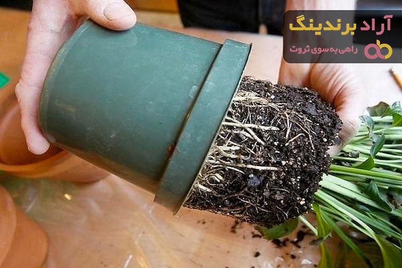 شاید لازم باشد که چند کشش ملایم را بر روی پایه ساقه ها آنها انجام دهید، سپس ریشه های گیاه را به آرامی با دستان خود شل کنید و میتوانید ریشه های نخ مانند خیلی بلند را هرس کنید. گیاه به ریشه متصل است زیرا که ریشه ها در دایره های بسیار محکمی در اطراف پایه گیاه رشد می کنند بنابراین بهتر است که ریشه ها را تا جایی که می توانید باز کنید و آنها را کوتاه نمائید.