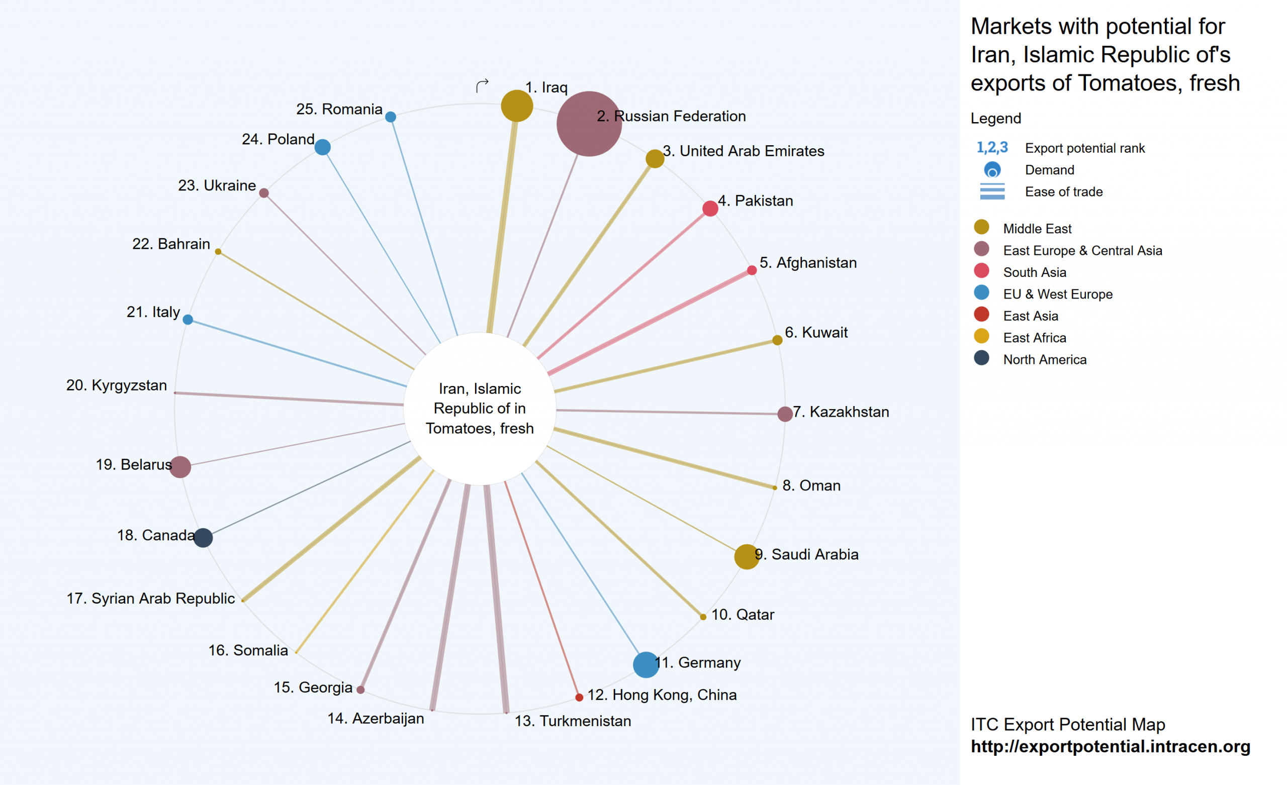 در این نمودار میزان توان و ظرفیت صادرات به کشورهای دیگر را به ترتیب عددی که نشان دهنده ی رتبه پتانسیل صادراتی و به ترتیب اندازه دایره که نشان دهنده ی میزان تقاضای کشورها و به ترتیب پهنای خط که نشان دهنده ی سهولت معامله با آن هاست میتوان مشاهده کرد و اسم هر کشور کنار دایره نوشته شده و رنگ دایره هر کشور طبق منطقه آن دسته بندی شده است برای مثال دایره های قرمز کشورهای منطقه شرق آسیا را نشان میدهد.