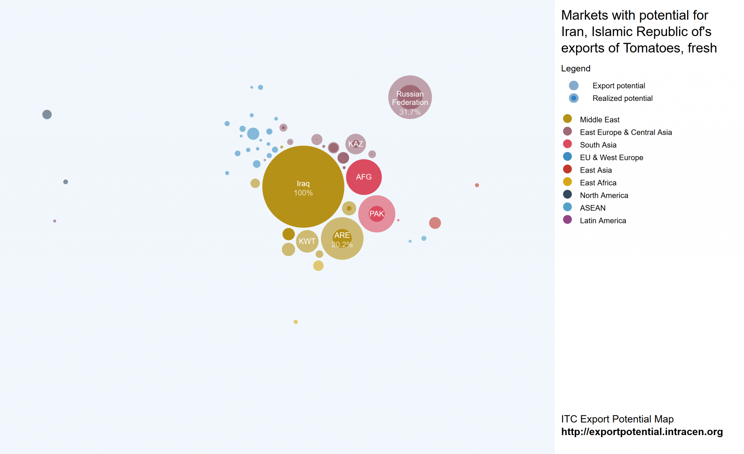 در این نقشه هر کشور با دایره و رنگ مربوط به منطقه آن نشان داده شده است. دایره داخلی و پررنگ تر هر کشور نشانگر میزان صادرات واقعی به آن کشور است و دایره کمرنگ تر دور آن نشان دهنده پتانسیل موجود بازار در آن کشور است. درصد نوشته شده در هر دایره بیانگر درصد پتانسیل صادرات به آن کشور است.