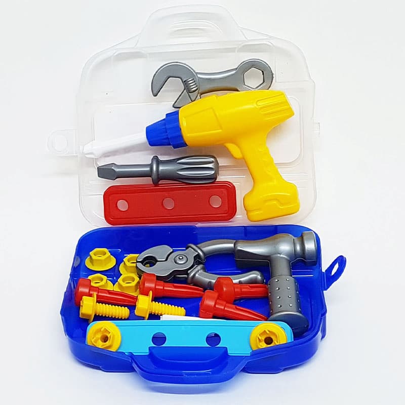 جعبه ابزار اسباب بازی کودکان دارای وسایلی مانند پیچ گوشتی پلاستیکی، انبردست، دریل، سیم چین، آچار فرانسه، دم باریک، چکش، میخ کش، میخ و وسایلی از این قبیل در قالب اسباب بازی است.