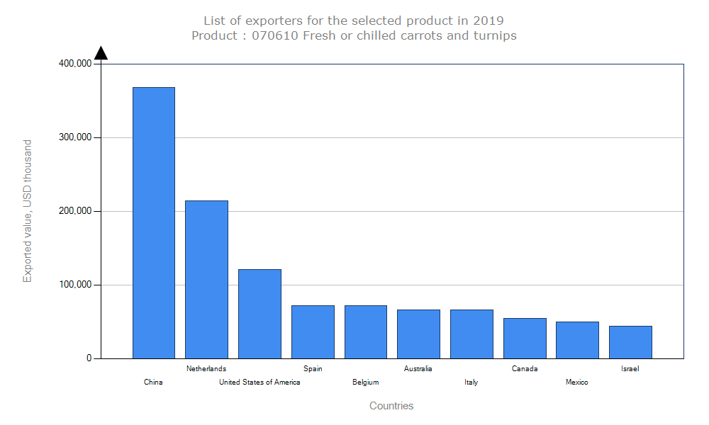 چین بیشترین میزان صادرات شلغم در جهان با ۲۶ درصد و ۳۶۸,۲۰۱ هزار دلار در بازار جهانی انجام می دهد. هلند، آمریکا، اسپانیا و بلژیک به ترتیب در رتبه های بعدی صادرات این محصول قرار دارند. در نمودار کشورهای واردکننده شلغم آلمان اولین رتبه در بازار جهانی را دارد. آمریکا، کانادا، روسیه و فرانسه در رتبه های بعدی قرار دارند. میزان واردات آلمان ۱۳ درصد از سهم بازار جهانی و ۱۶۹,۴۶۱ هزار دلار است.