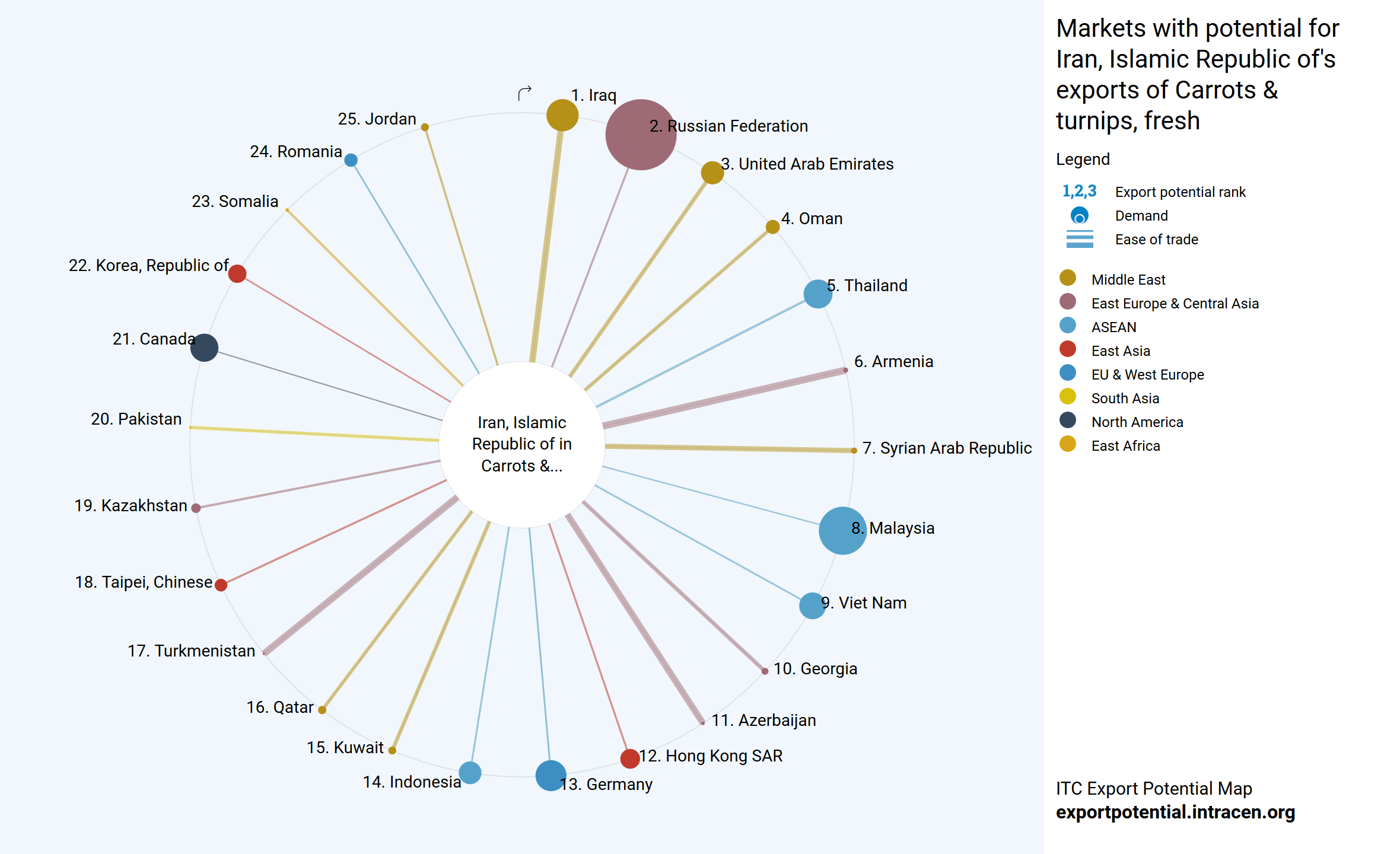 بیشترین ظرفیت و پتانسیل صادراتی برای صادرات شلغم با توجه به ظرفیت بازار و روابط تجاری آسان را کشورها عراق، روسیه و امارات دارا هستند. ایران نزدیکترین ارتباط صادراتی را با ارمنستان دارد.
