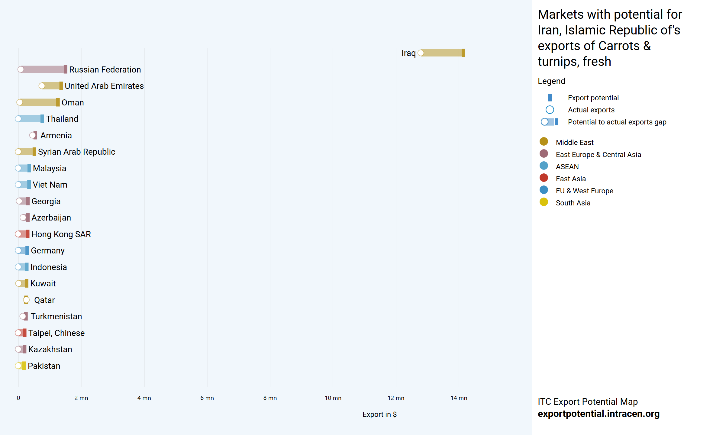 روسیه بیشترین تفاوت بین پتانسیل صادرات و صادرات واقعی را از نظر ارزش نشان می دهد، ظرفیت باقیمانده صادرات به ارزش ۱٫۳ میلیون دلار است.