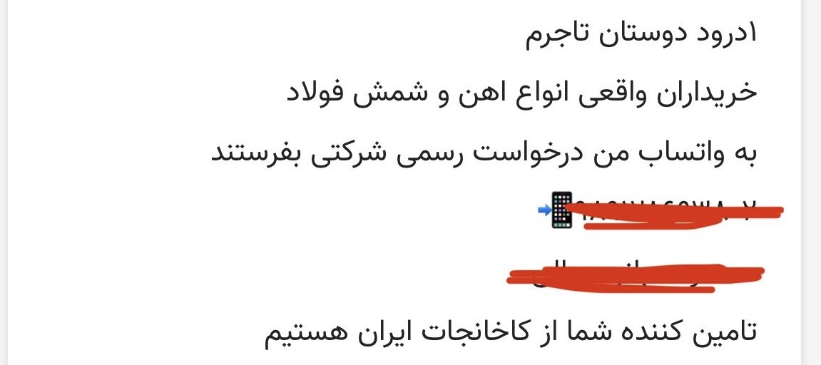 اینجا می گوید: خریداران واقعی انواع آهن و شمش فولاد به واتساپش درخواست رسمی شرکتی بفرستند.