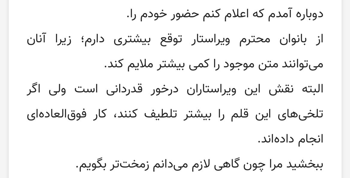 وقتی نویسنده می خواهد متنش را تند بنویسد یعنی نیتی داشته است و ویراستار که نمی تواند آن را ملایم کند.