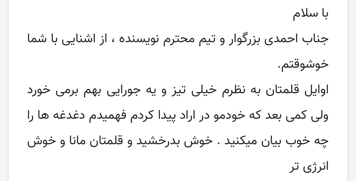 هر جا خیلی تندی متن آزارتان داد گزارش تخلف در منوی سایت گزینه تخلف کارمندان بنویسید: شاکی ام از پارسا احمدی از تیم نویسندگان.