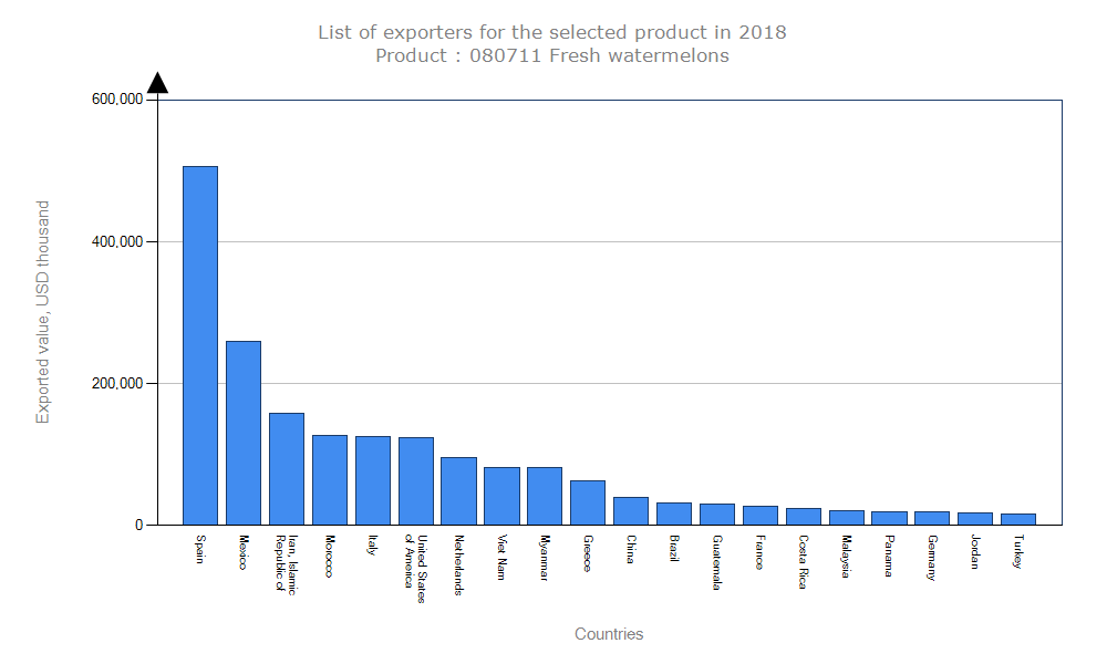 همانطور که نمودار بالا نشان می دهد هندوانه از آمار رو به رشدی برخوردار است و لهستان، آلمان، اسپانیا، سوئد، فرانسه، هلند، انگلیس، بلژیک، استرالیا، ایتالیا، چک، نروژ و سوئیس دارای بازار با ظرفیت رو به رشد هستند. همانطور که در بالا گفته شد هندوانه از جمله محصولاتی است که برای پرورش آن آب زیادی لازم است. به همین دلیل بسیاری از کشورها این میوه را تولید نمی کنند.
