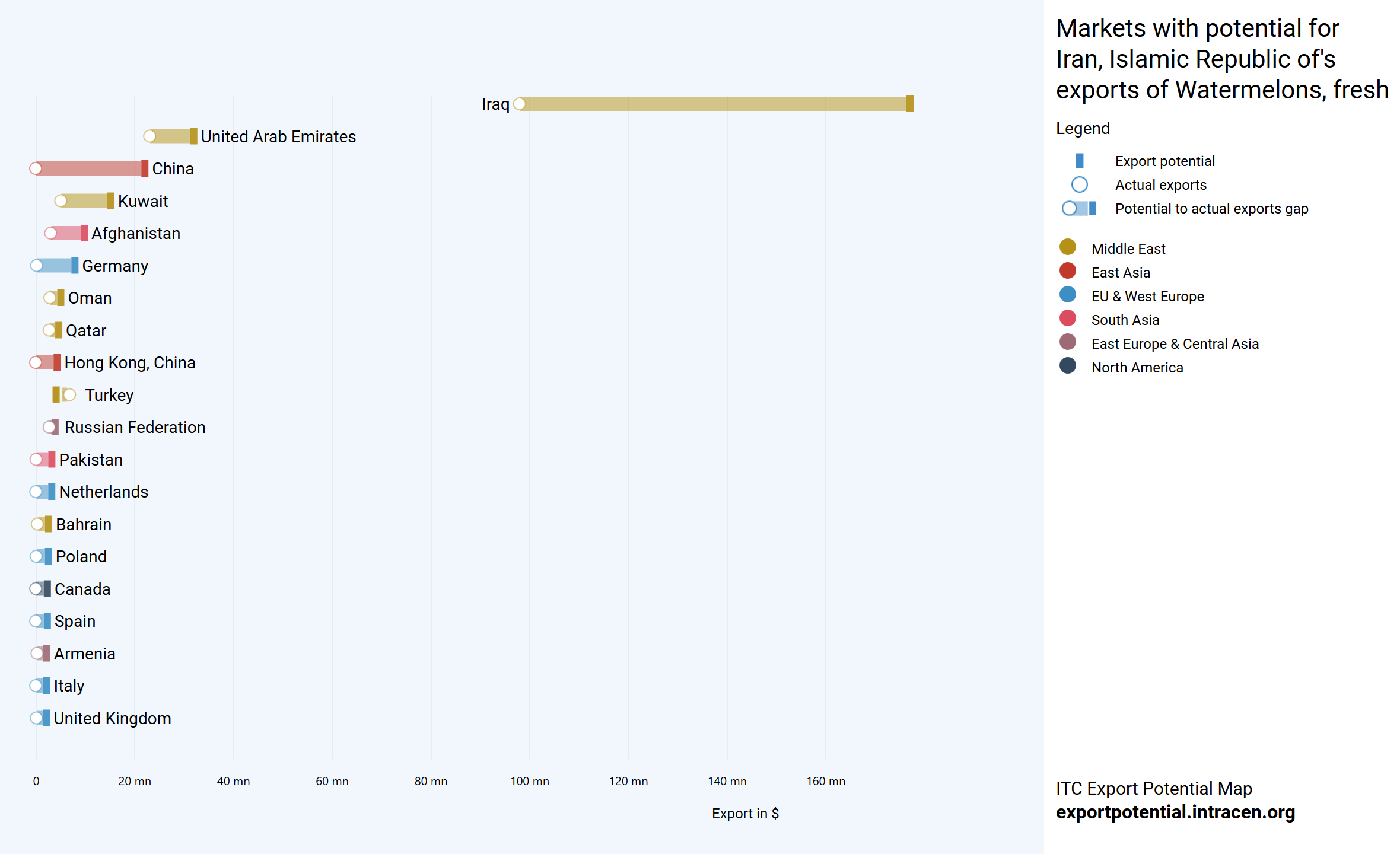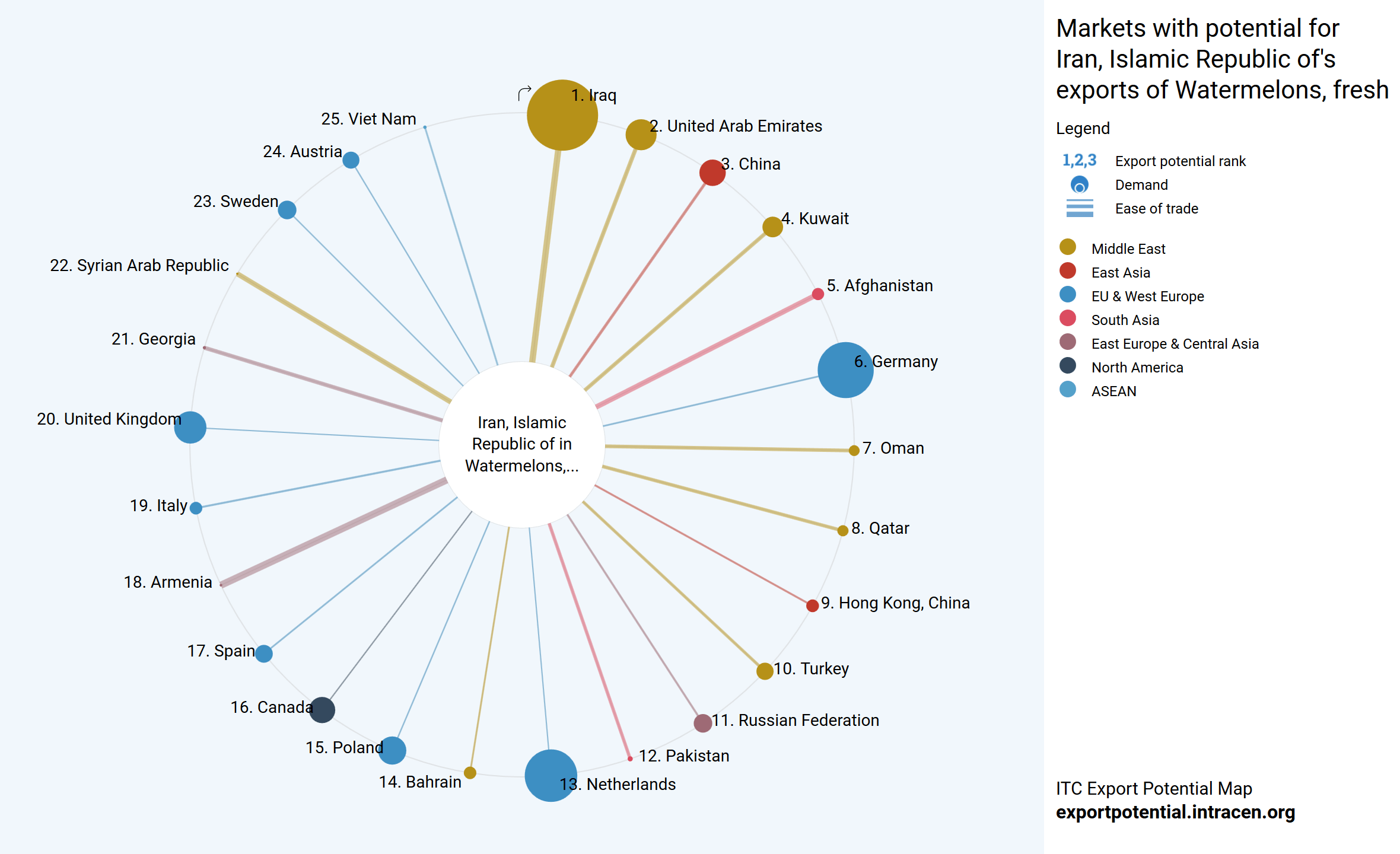 با توجه به نمودار زیر کشورهای عراق، امارات و کویت در خاورمیانه و هم چنین آلمان، هلند و انگلیس در اروپا دارای پتانسیل بالا برای صادرات هندوانه از ایران هستند. روسیه نیز دارای بازار خوبی با توجه به نزدیکی به ایران را دارا است.