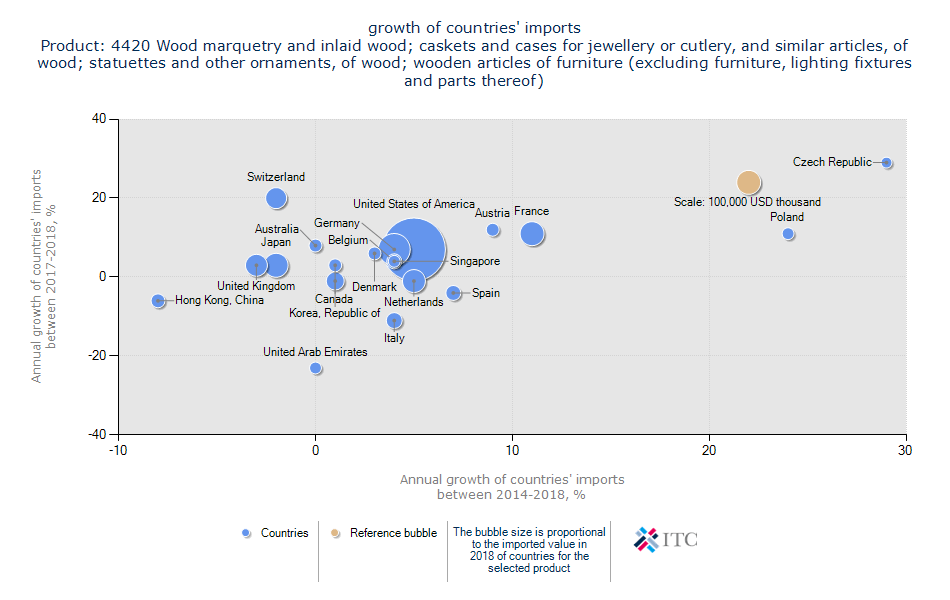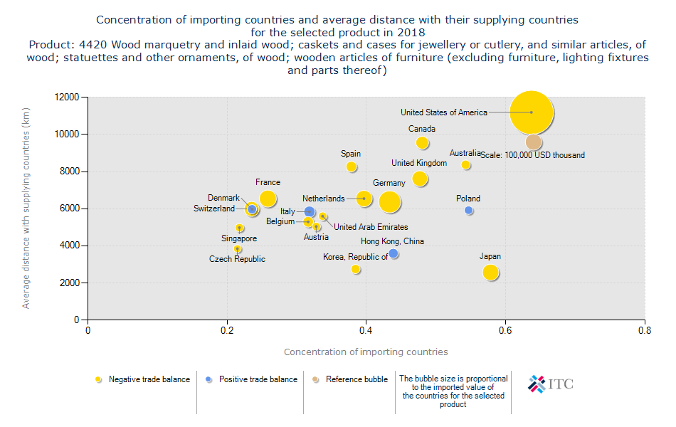 چنانچه زیر صفر و منفی باشد یعنی فرصت های تجاری این بازار در حال از بین رفتن است و آینده قابل پیش بینی ندارد و تمرکز اصلی را باید روی بازارهای کشورهای به سمت بالای نمودار متمرکز کرد. حجم و اندازه دایره های این نمودار نیز نشان دهنده ی رقم میزان تجارت کشورهاست. بیشتر بخوانید: چوب گردو خشک