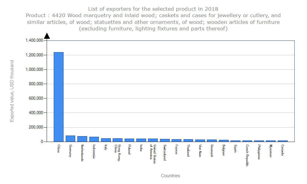 ارزش واحد: ۱۱ درصد و میانگین فاصله از کشور وارد کننده: ۶,۹۷۴ کیلومتر می باشد. آمار واردات مصنوعات چوبی در واردات: هدف شناخت متقاضیان و پتانسیل های کار در بازار جهانی است. رقم کل واردات: ۲,۰۹۸,۰۳۴,۰۰۰ دلار میزان رشد بازار براساس ارزش واحد در ۵ سال اخیر: ۳ درصد میزان رشد یک ساله براساس ارزش واحد: ۶ درصد و میانگین فاصله از کشور صادر کننده: ۷,۹۳۱ کیلومتر می باشد.