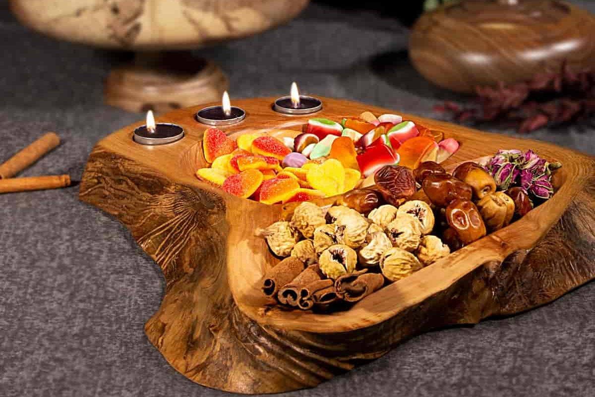 برخی از طراحیهای این ظروف همچون سینی چوبی که از جنس چوب می باشند بسیار سخت و زمان بر می باشند که نیاز به تمرکز و حوصله بسیار زیادی دارد و پس از آماده شدن با استفاده از پولیش و مواد مختلف روکش بندی می شوند و نمای شیکی بدست می آورند. برخی از این ظروف به صورت ساده و یک سینی صاف می باشد که دارای چند خانه است که ممکن است شیرینیها و یا مغزجات و یا آجیل درون آنها قرار بگیرد.