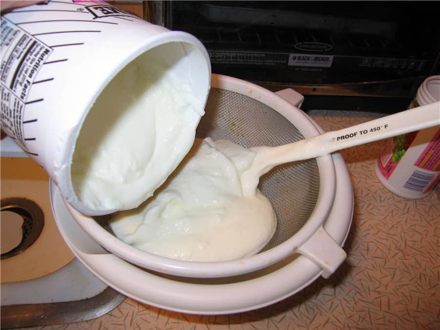 کیسه توری را داخل یک صافی قرار داده و صافی را روی یک قابلمه تفلون بگذارید تا آب گرفته شده از ماست درون آن بریزد و سپس ماست را درون کیسه پارچه ای توری شکل بریزید و کیسه را گره بزنید و به مدت چند ساعت به همین شکل رها کنید تا آب ماست به خوبی خارج شود مدت زمان لازم برای این کار بستگی به میزان چربی ماست دارد.