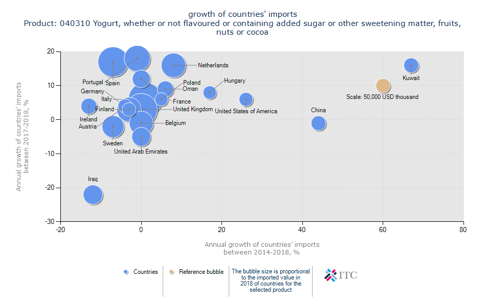با توجه به نمودار بالا واردات ماست در یک سال گذشته رشد خوبی داشته است اما رشد ۵ ساله آن زیاد قابل توجه نبوده است. کشور کویت دارای بهترین بازار رو به رشد است. کشورهای هلند، عمان، مجارستان، لهستان و آمریکا نیز در رتبه های بعدی قرار دارند.