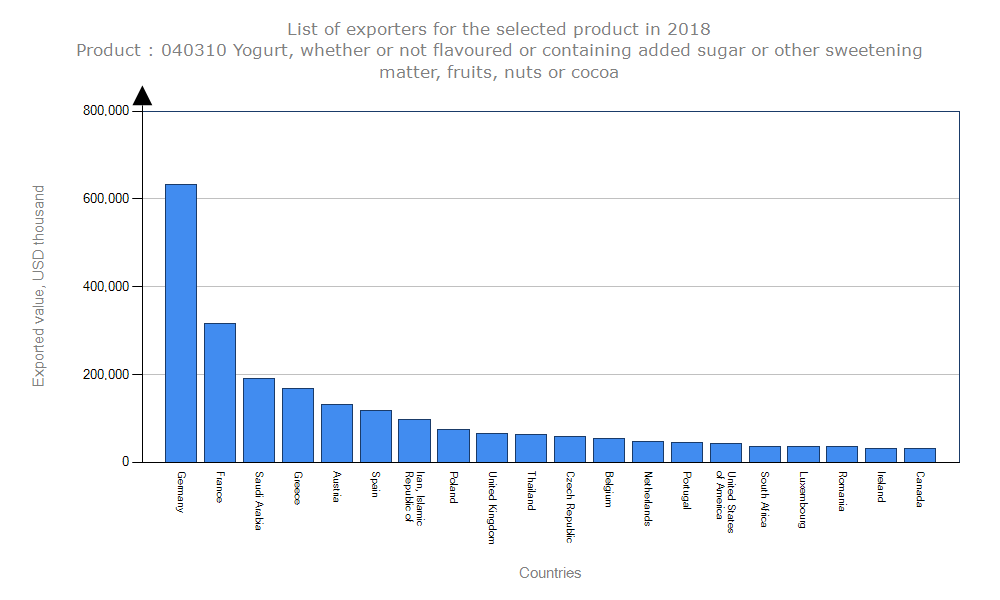 آلمان بیشترین صادرات ماست در دنیا را دارد و کشورهای فرانسه، عربستان، مصر، ارمنستان، اسپانیا، ایران، لهستان، انگلیس و تایلند در رتبه های بعدی صادرات این محصول قرار دارند. کشور های ایتالیا، انگلیس و اسپانیا سه وارد کننده اول ماست هستند. آلمان نیز که خود بزرگترین صادر کننده ی ماست است رتبه چهارم در واردکننده ها را دارا است و از عمل Re Export استفاده می کند.