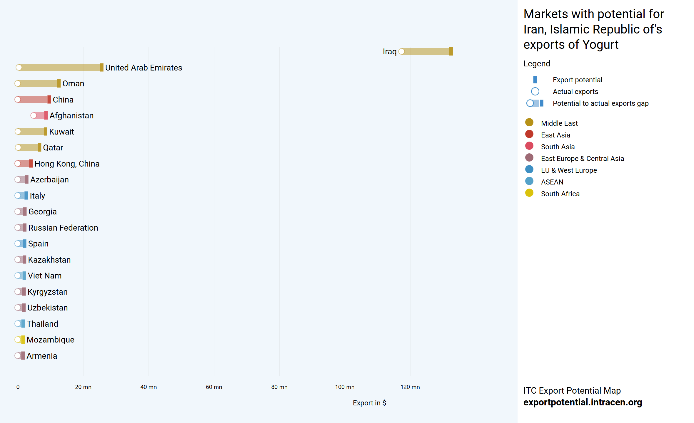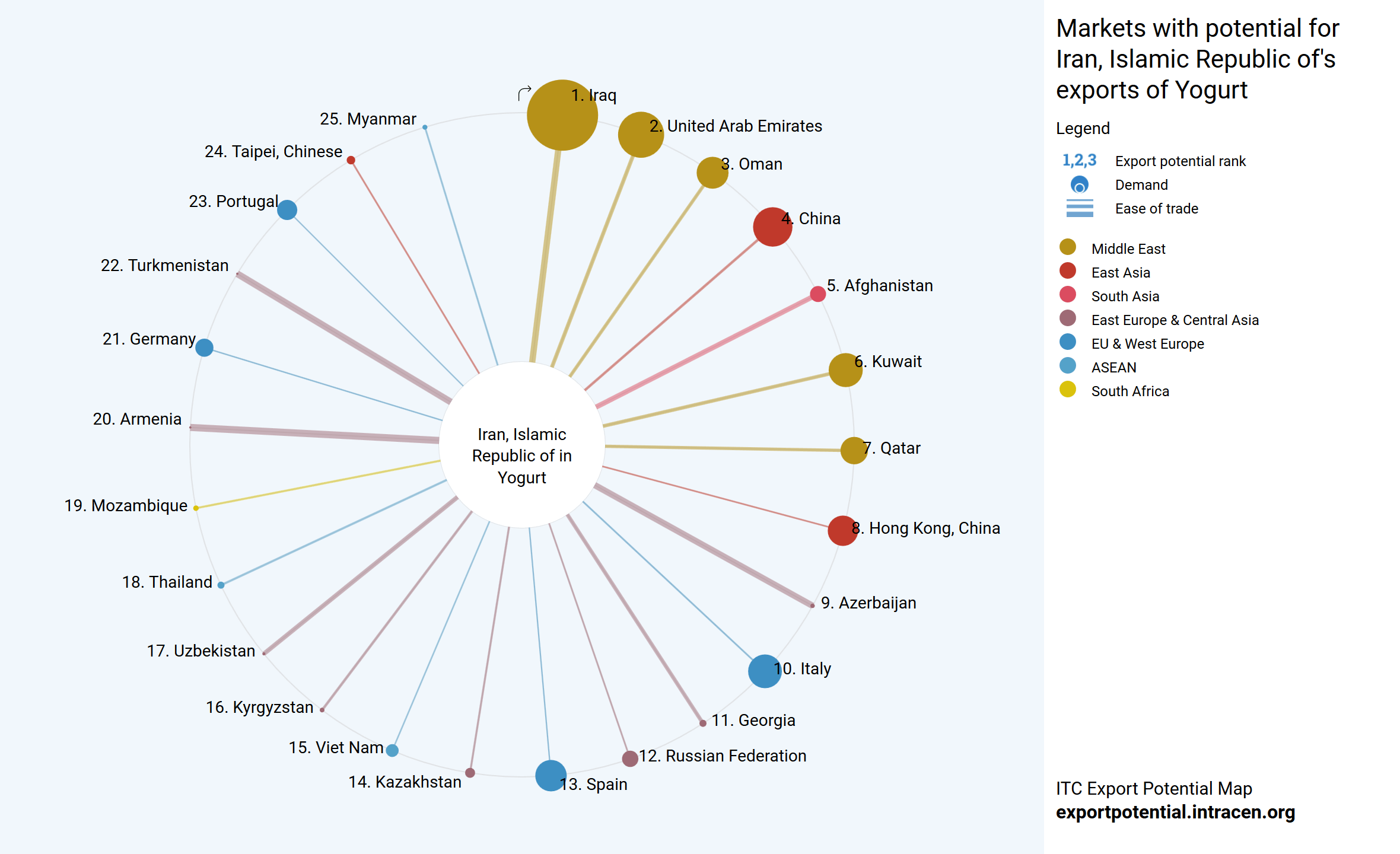 با توجه به نمودار زیر در خاورمیانه کشورهای عراق، امارات و عمان دارای بیشترین ظرفیت صادراتی هستند. چین در شرق آسیا نیز میتواند مورد توجه تاجرین قرار بگیرد. در اروپا نیز ایتالیا، اسپانیا و آلمان دارای پتانسیل مناسبی برای صادرات ماست هستند.