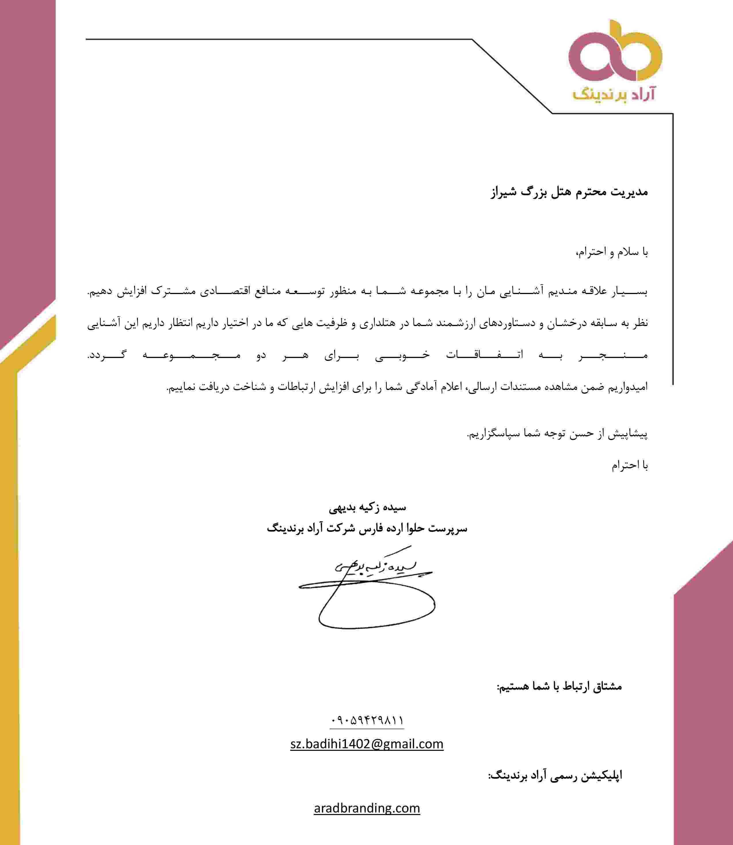 پس از تأیید و انتصاب به این سمت سازمانی، تاجر این اجازه را خواهد داشت که با سربرگ رسمی آراد برندینگ، به جامعه هدف خود نامه مکتوب ارسال کند، خود را با این نام در همه فعالیت های تجاری اش معرفی نماید و با این اعتبار تجارتش را رشد دهد.